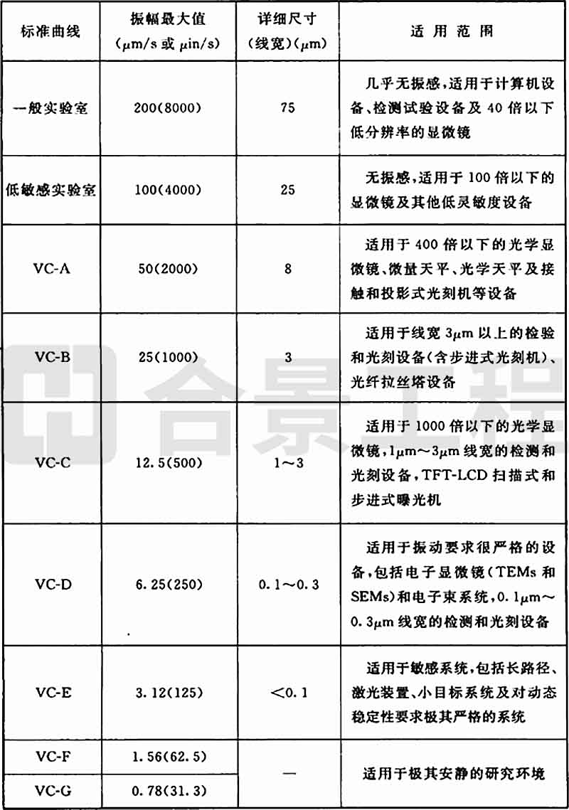 A.0.2 精密設備、儀器容許振動標準曲線的應用應符合表A.0.2的要求。